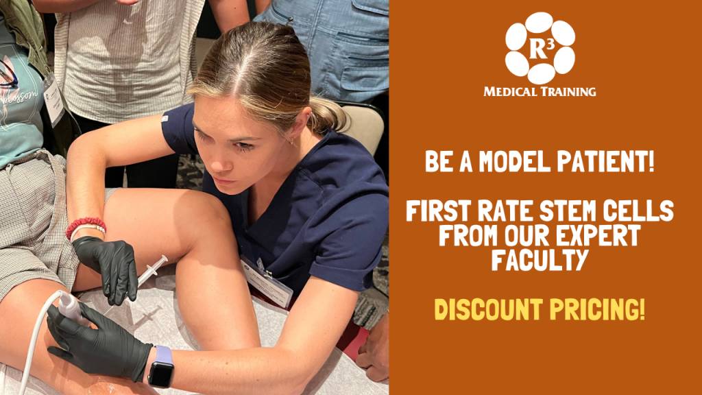 R3 Medical Training’s faculty is now offering patients in Phoenix/Scottsdale and Nashville a unique opportunity to receive stem cell, exosome and PRP therapies for significantly less than what practices are charging nationwide. Why? Because our expert faculty doctors teach providers who come in to learn at courses, and we need patient models!